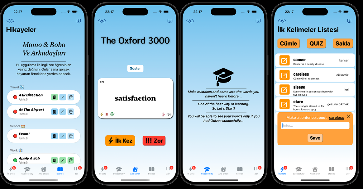 A mobile language learning application focused on vocabulary training and quiz-based learning. The app is designed with a clean interface and aims to make language practice simple and interactive.